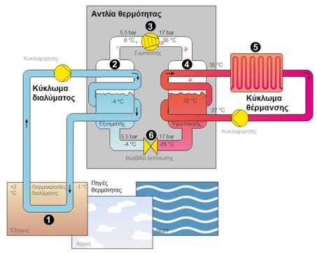 Το διάλυμα νερού με αντιψυκτικό που κυκλοφορεί στο κύκλωμα γεωεναλλάκτη παίρνει την ενέργεια από το έδαφος, τα υπόγεια νερά ή τον αέρα.