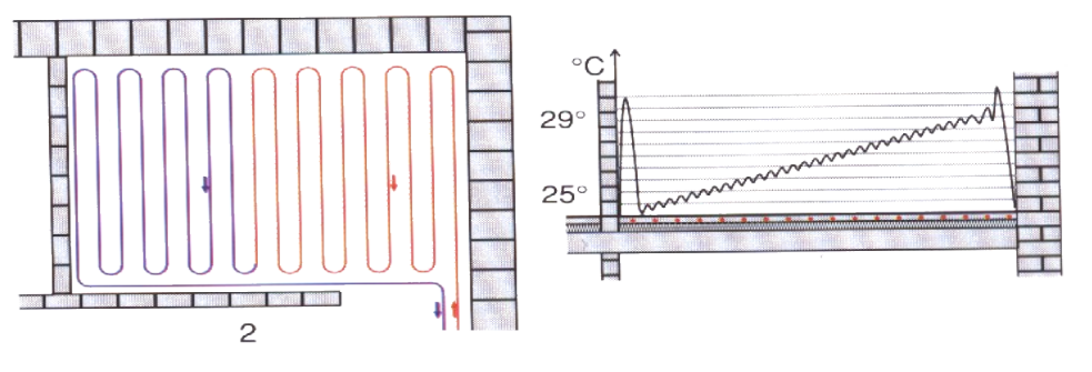 Β) Τοποθέτηση σωληνώσεων ανταγωνισμού σε σχήμα μαιάνδρου - Μη σωστή κατανομή θερμοκρασίας στο χώρο